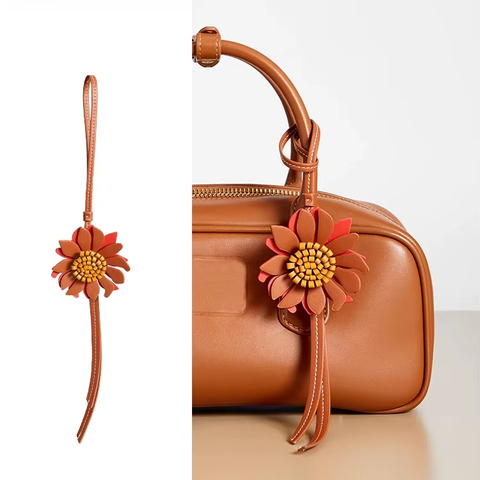 Abalorio de bolso de cuero de grano superior de girasol, flor de piel de vaca con correa trenzada y anillo, 33,5 cm, colgante de monedero/mochila